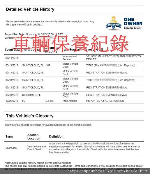 HP高雄車庫替客戶代辦CPO進口外匯車可依客戶需求購買CARFAX及AutoCheck報告,若有買車,費用則可於代辦費中吸收。