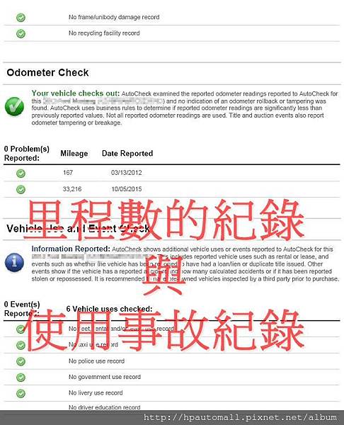 如上圖及下圖在AutoCheck報告中除了一些基本資料外,像是里程數的紀錄,車輛保養紀錄...