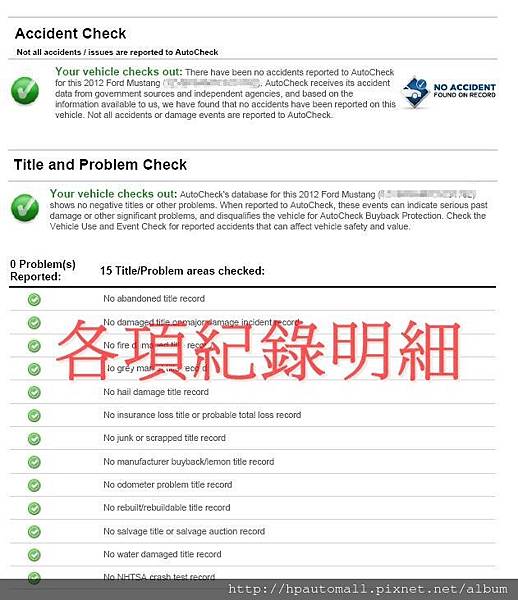 上圖是一台2012 FORD 野馬 Autocheck報告,