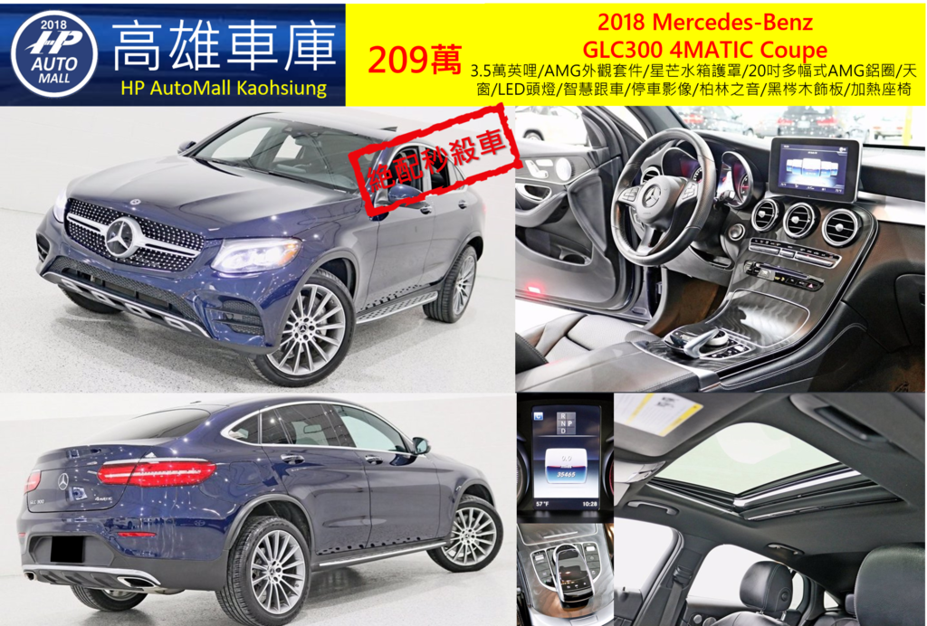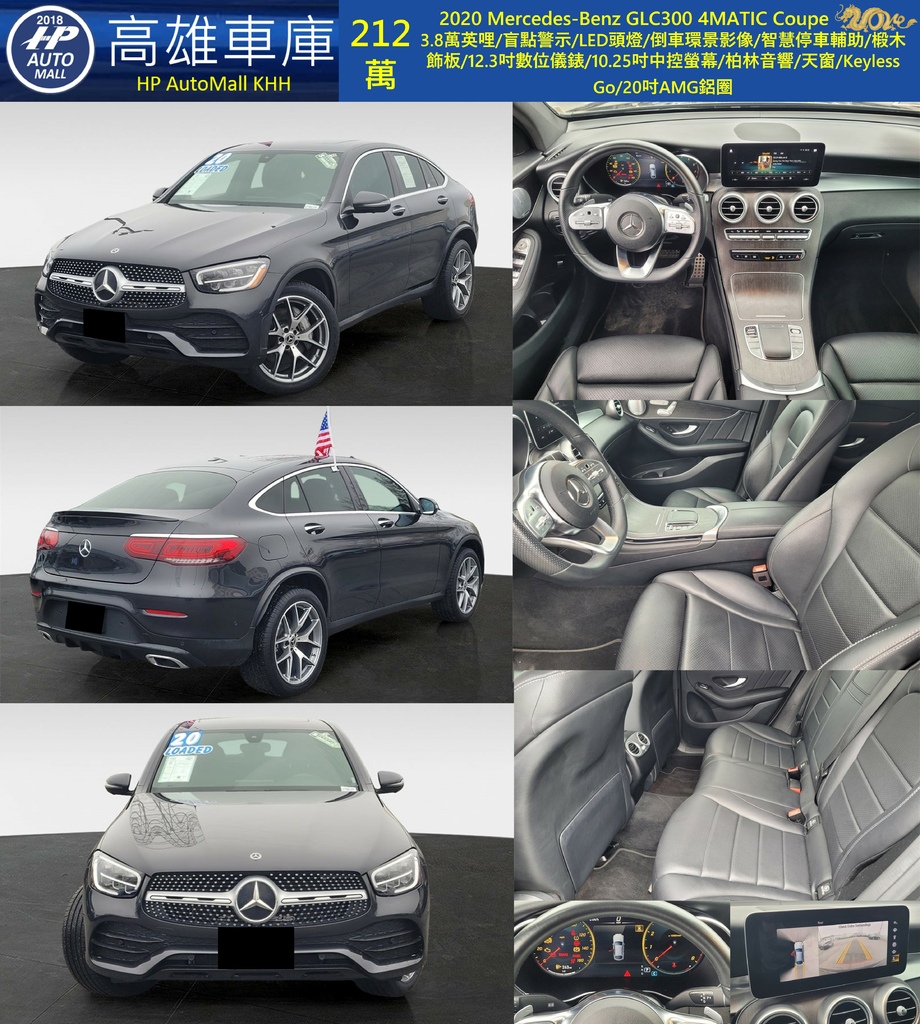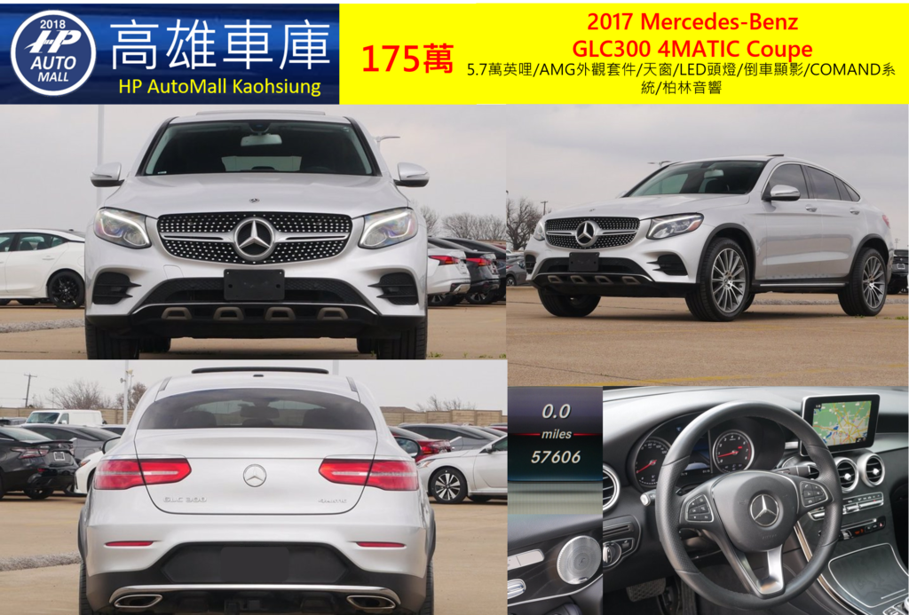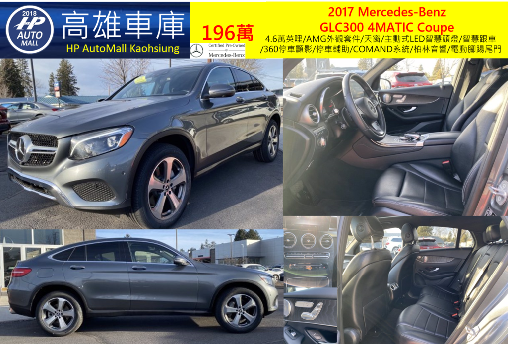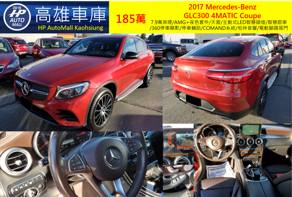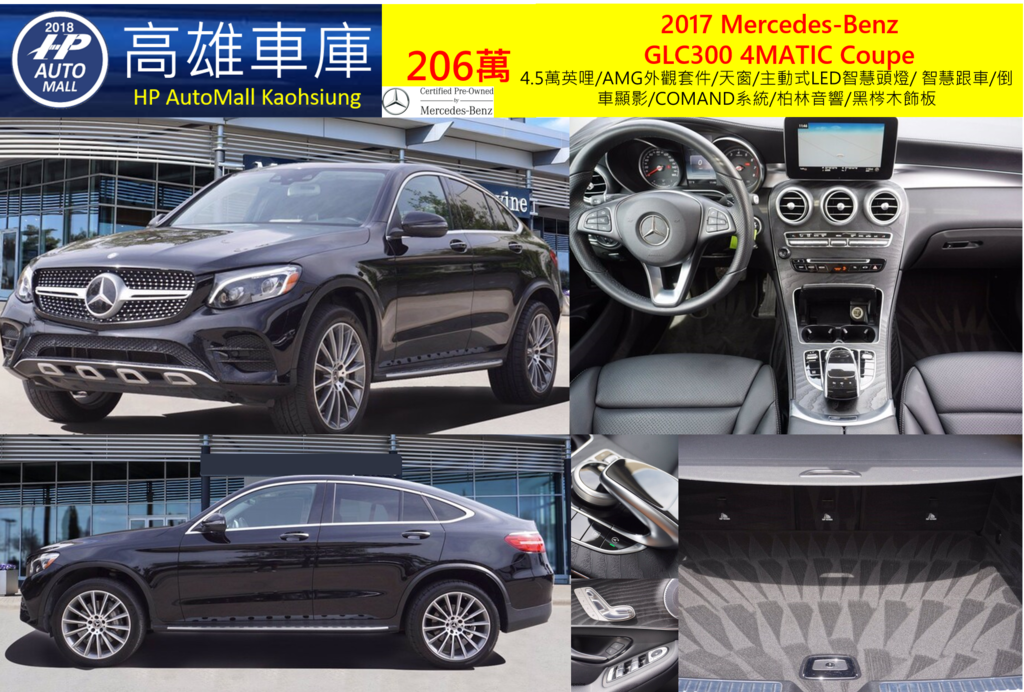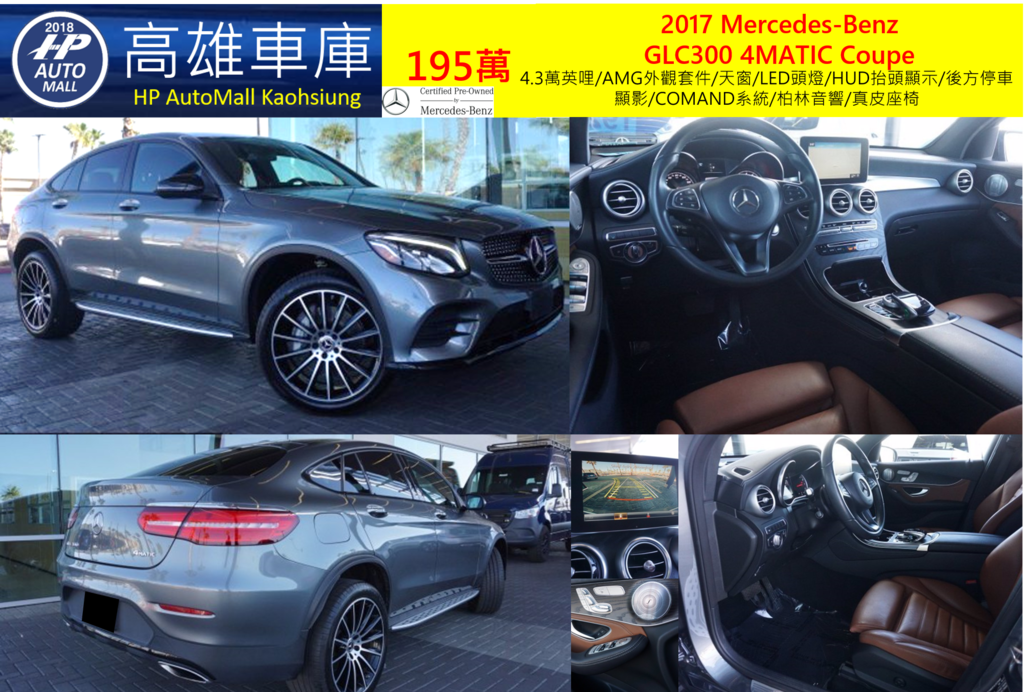 HP高雄車庫精選 GLC300 Coupe, 第一台是 167萬, 2017年2月出廠, 69,045哩、四驅、LED頭燈、盲點偵測、COMAND大螢幕、天窗、Keyless免鑰匙、電動尾門、柏林之音、發光立標、迎賓燈、倒車影像。