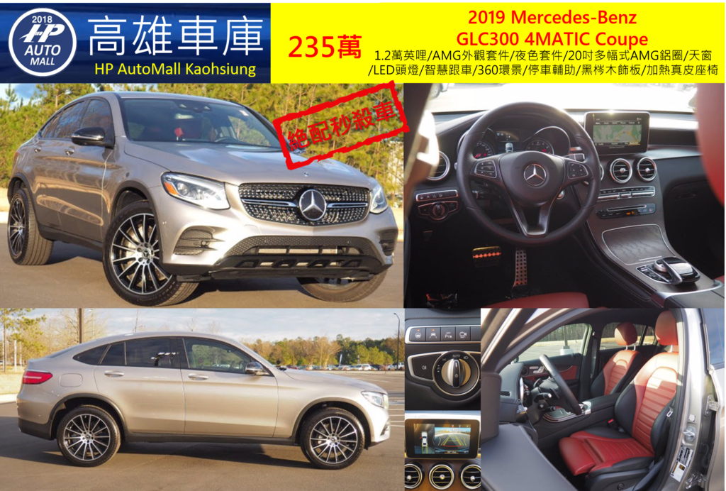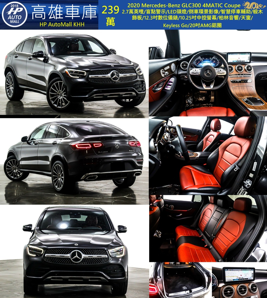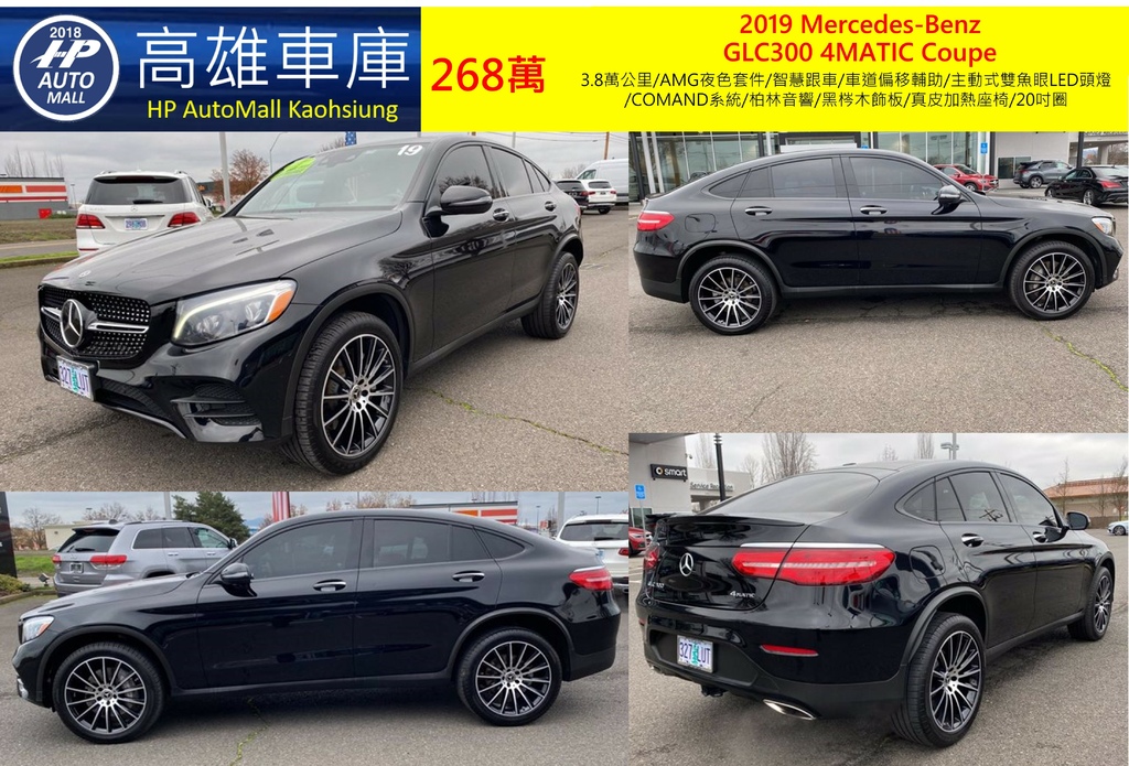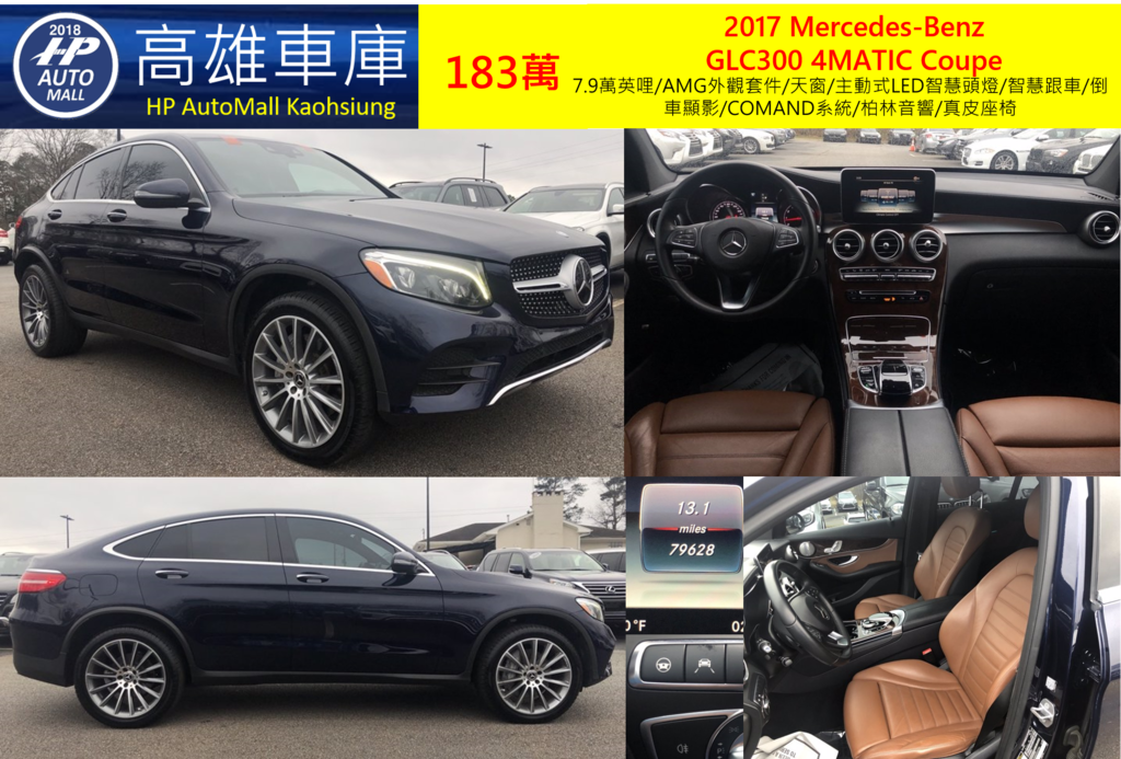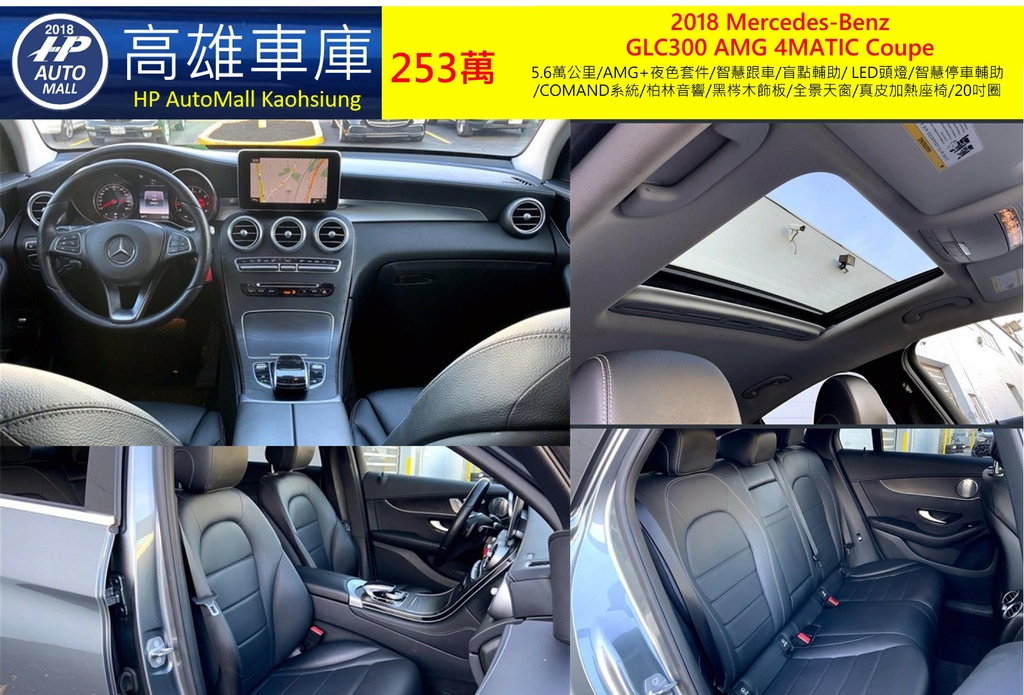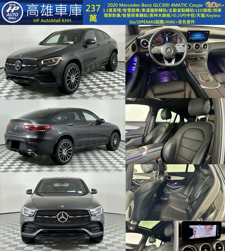 HP高雄車庫精選 GLC300 Coupe, 第一台是 167萬, 2017年2月出廠, 69,045哩、四驅、LED頭燈、盲點偵測、COMAND大螢幕、天窗、Keyless免鑰匙、電動尾門、柏林之音、發光立標、迎賓燈、倒車影像。