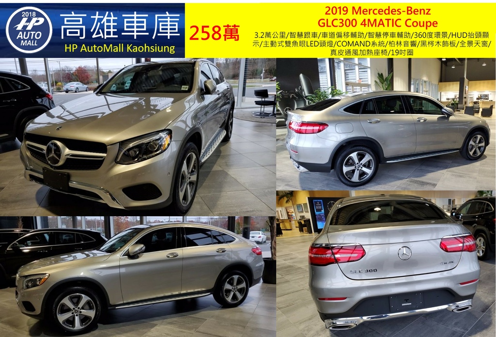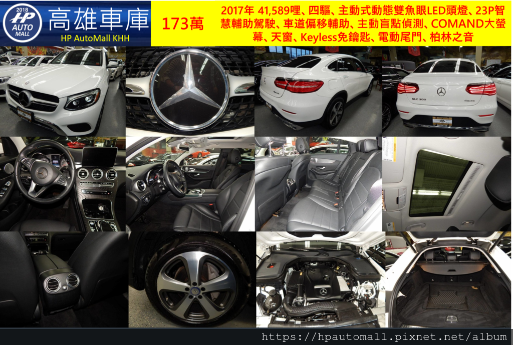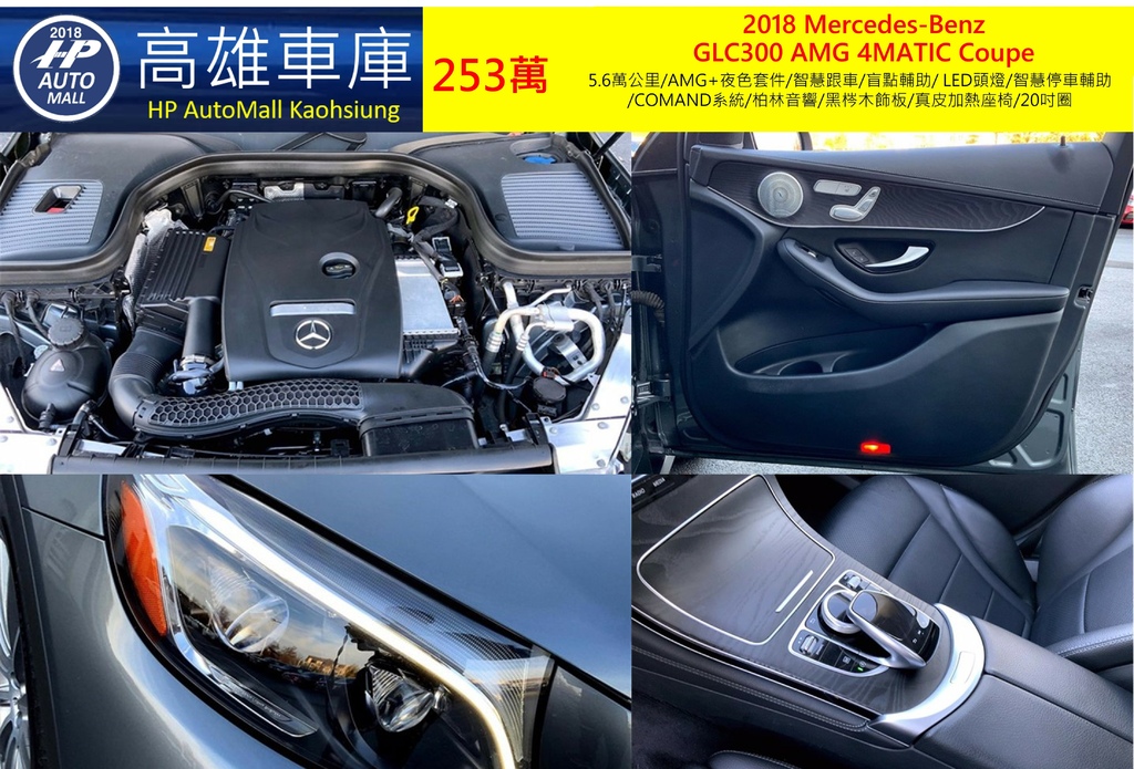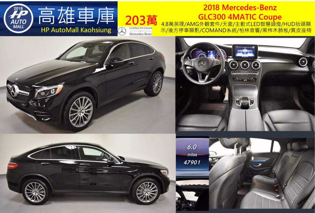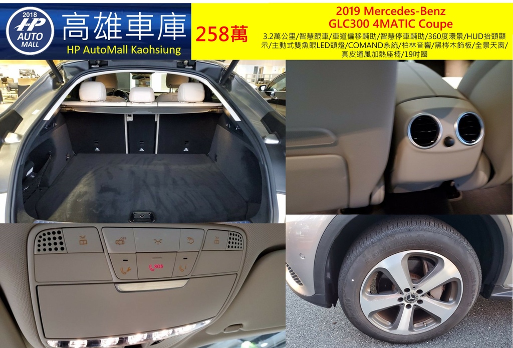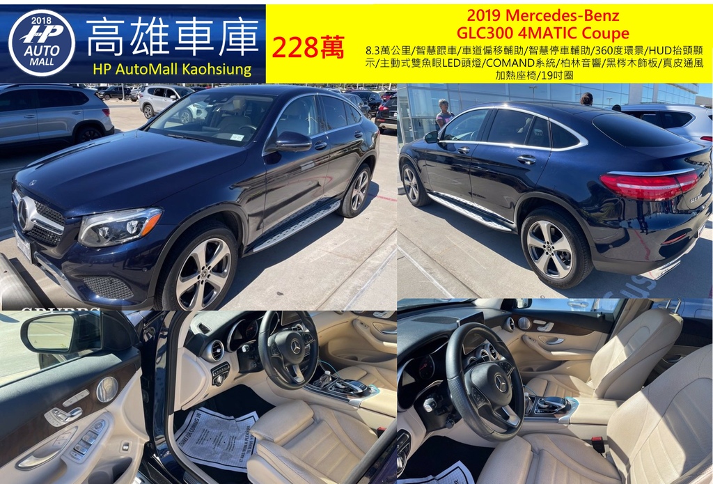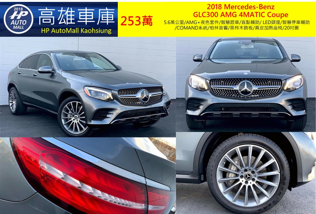 HP高雄車庫精選 GLC300 Coupe, 第一台是 167萬, 2017年2月出廠, 69,045哩、四驅、LED頭燈、盲點偵測、COMAND大螢幕、天窗、Keyless免鑰匙、電動尾門、柏林之音、發光立標、迎賓燈、倒車影像。