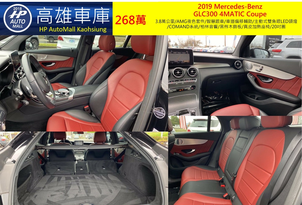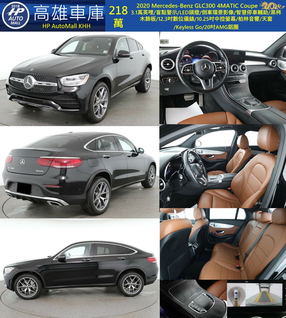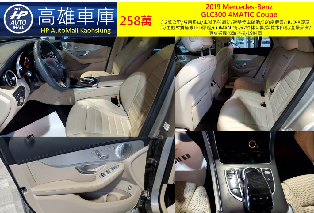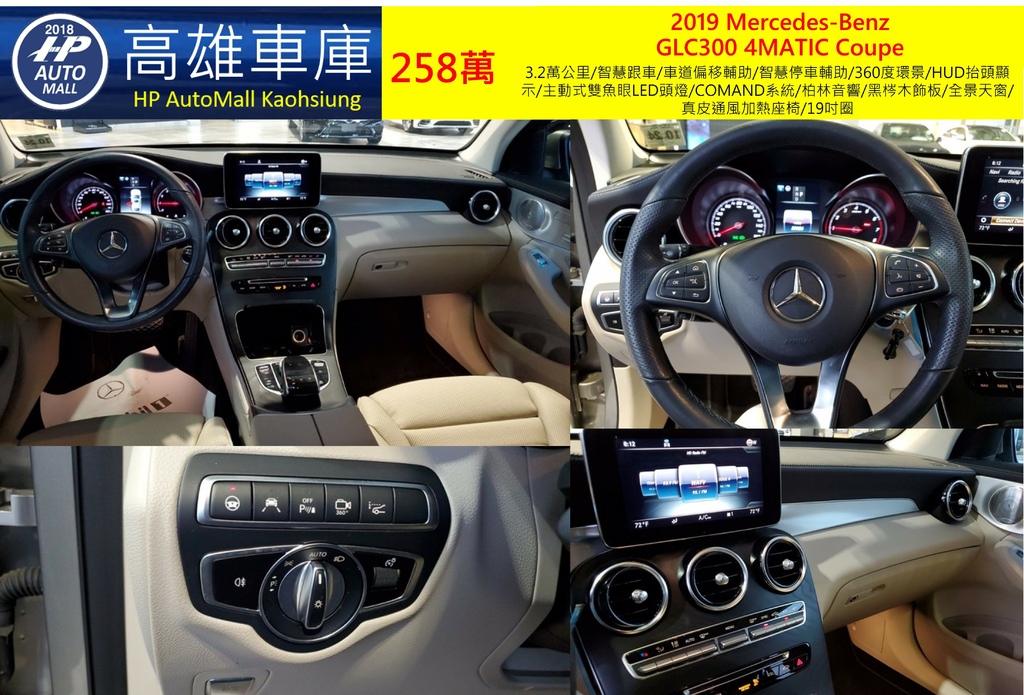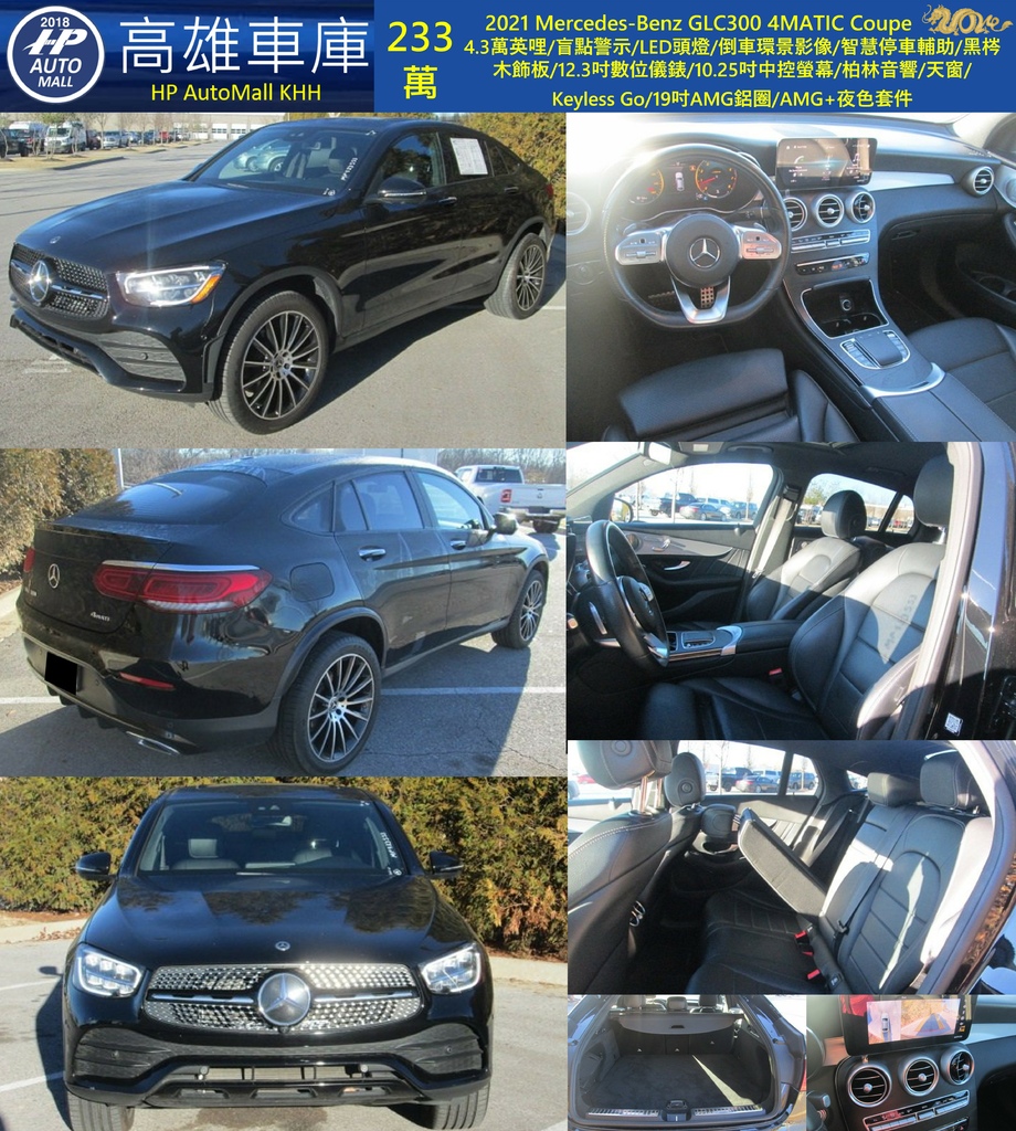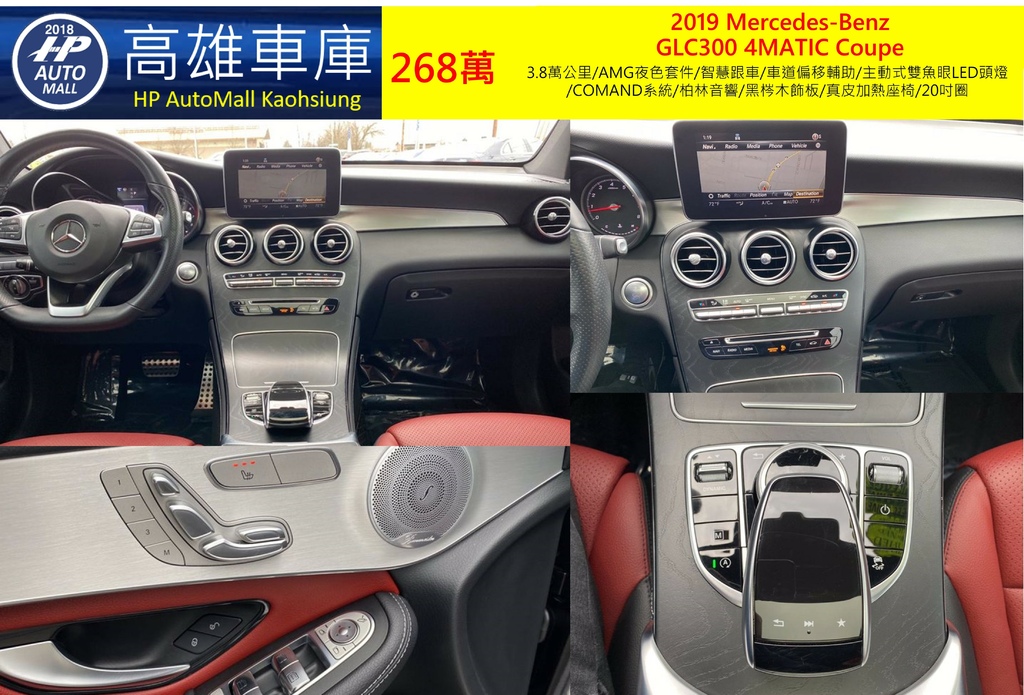HP高雄車庫精選 GLC300 Coupe, 第一台是 167萬, 2017年2月出廠, 69,045哩、四驅、LED頭燈、盲點偵測、COMAND大螢幕、天窗、Keyless免鑰匙、電動尾門、柏林之音、發光立標、迎賓燈、倒車影像。